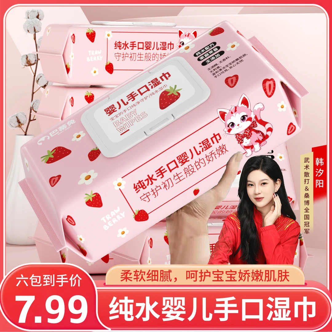 【巴蒂兔】纯水湿巾6包婴儿湿巾宝宝手口专用学生擦嘴湿巾一次性a3